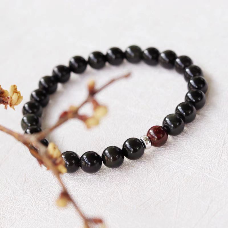 Natural Obsidian Bracelet for Men and Women, Korean Edition Silver Head Jewelry, Personalized Buddha Bead Transport Bracelet, Birthday Gift for Couples